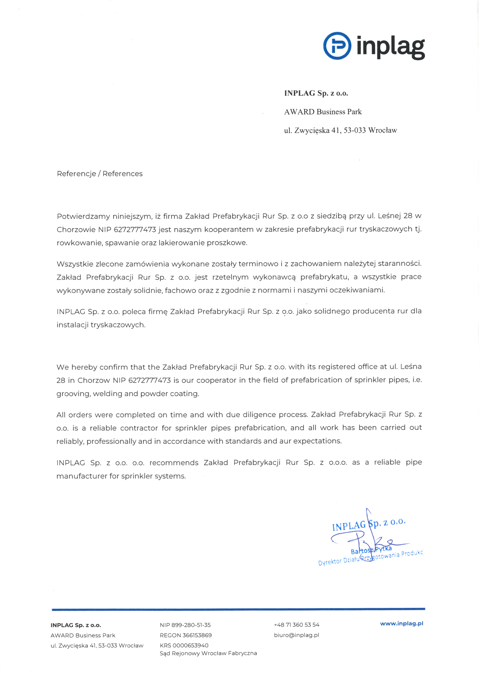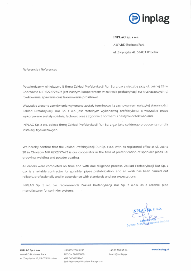Als Rohrvorfertigungsbetrieb beschäftigen wir uns mit der Vorfertigung von Rohren für Brandschutzanlagen und deren Montage. Wir führen Installationen gemäß den Normen NFPA, FM Global und PN-EN 12 845 durch. Wir planen das VDS-Zertifikat zu beantragen